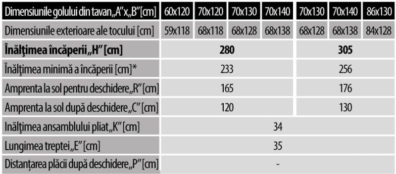 Sarcina maxima admisa [kg]: 200 Coeficientul de transmitanta termica usa U [W/m2K]: 0,79** Rezistenta la foc [min]: EI2 120 Grosimea usii [cm]: 8,2 Grosimea izolatiei [cm]: 8 Inaltimea tocului [cm]: 16 Latimea treptei [cm]: 13 Inaltimea maxima a incaperii [cm]: 280 sau 305
