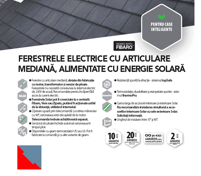 FAKRO FTU-V U3 SOLAR este dotată standard cu un panou solar pozitionat in partea superioara a cadrului, Ftp-V Solar este operat prin exploatarea energiei produsa de soare si de aceea nu are nevoie sa fie conectat la sistemul electric al locuintei. În acest sens se configurează ca o fereastră sustenabilă din punct de vedere al consumului de energie, precum și un model cu adevărat funcțional, capabil să permită instalarea unei ferestre automatizate chiar și în conditiile în care o racordare la rețeaua de energie electrică nu este posibilă.