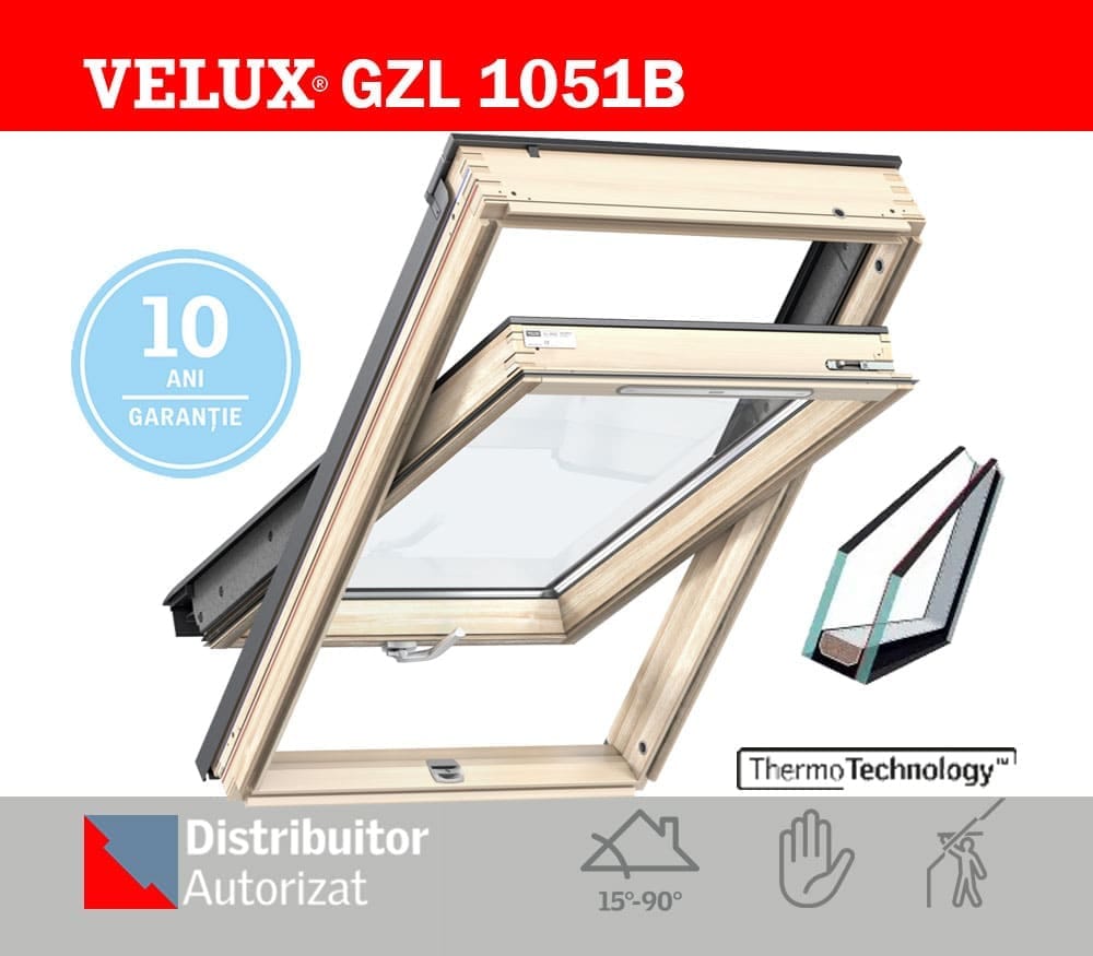 VELUX GZL 1051B este o fereastra de mansarda originala din lemn, cu mâner elegant din zinc, situat în partea de jos. Sistemul inovator ThermoTechnology™ cu garnitură suplimentară. Acest sistem izolator unic îți transformă fereastra într-un scut extrem de puternic împotriva vântului și temperaturilor reci.