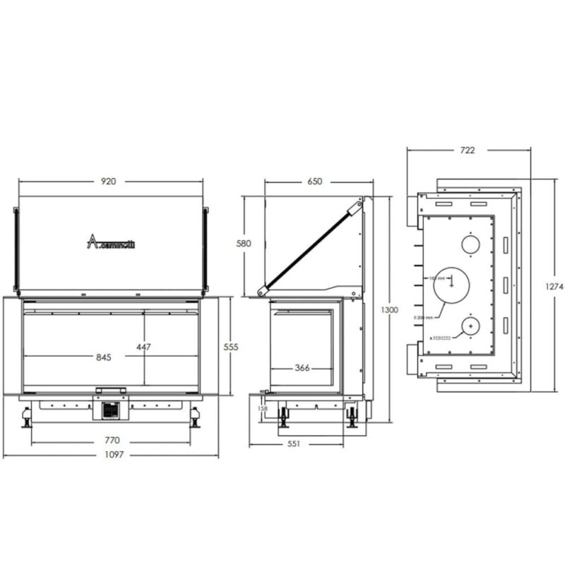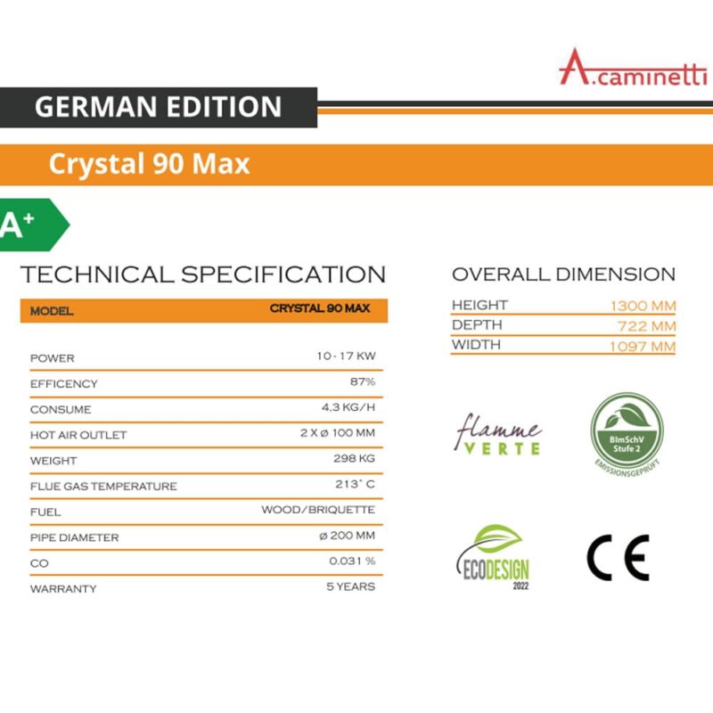 CRYSTAL 90 MAX este un focar spectaculos cu trei laturi vitrate, a carui usa se deschide atat prin glisare verticala, cat si normal pentru curatare si inspectie. Latura principala din sticla masoara 85 cm, fiind unul dintre cele mai mari focare disponibile in acest moment pe piata. Modelul CRYSTAL 90 MAX este produs de compania A-CAMINETTI si are o putere nominala de 14kW. Focarul este construit dupa cele mai stricte normative in vigoare, asigurand un randament foarte bun, de 87%. Focarul este realizat din otel special, are interiorul captusit cu vermiculita.