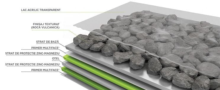 Modulul CLASSIC este realizat din oțel, protejat anticoroziv pe ambele fețe cu aliaj ZnMg 250 g/mp plus protecție suplimentară anticorozivă multiface®, profilat prin presare și ulterior finisat cu rocă vulcanică. Stratul de protecție multiface® reprezintă un tratament performant aplicat oțelului, cu o grosime de 1 până la 2 microni, fiind un etanșant multifuncțional aproape invizibil (acoperire organică subțire) aplicat pe benzile de oțel galvanizat la cald (ZnMg). Proprietățile sale remarcabile îi oferă oțelului o etanșare premium durabilă, cu rezistență excelentă la coroziune.