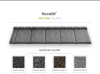 Novatik NATURA SLATE oferă aspectul plăcilor de ardezie, îmbinat perfect cu rezistența oțelului. Imaginea de ansamblu a acoperișului NATURA SLATE este atipică pentru țiglele metalice datorită designului modulelor ce permite crearea unei configurații care te duce cu gândul la învelitorile din plăci de ardezie. Acest profil plat se pretează atât placărilor verticale cât și acoperișurilor înclinate, reprezentând soluția ideală pentru construcțiile cu un design modern, contemporan, dar și pentru renovări. Învelitorile plate în culori neutre reprezintă principalele tendințe în arhitectura modernă, fiind ușor de integrat în proiectele contemporane.
