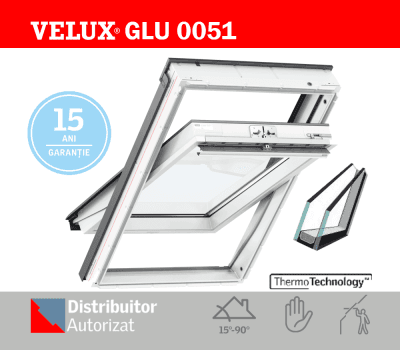 VELUX GLU 0051 cu sistemul inovator ThermoTechnology™ cu garnitură suplimentară. Acest sistem izolator unic îți transformă fereastra într-un scut extrem de puternic împotriva vântului și temperaturilor reci.