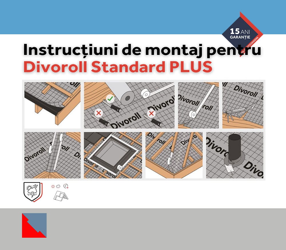 Divoroll Standard Plus este o membrană cu 3 straturi, în culoare gri deschis, disponibilă în role de 1,5 m × 50 m (11,4 kg/rolă). Cu o greutate de 145 g/m² și o valoare Sd de 0,03 m, asigură o difuzie excelentă a vaporilor și protecție împotriva apei (clasa W1, coloană de apă >3000 mm). Rezistă la temperaturi între -40°C și +80°C și poate fi lăsată expusă la intemperii până la 2 săptămâni.