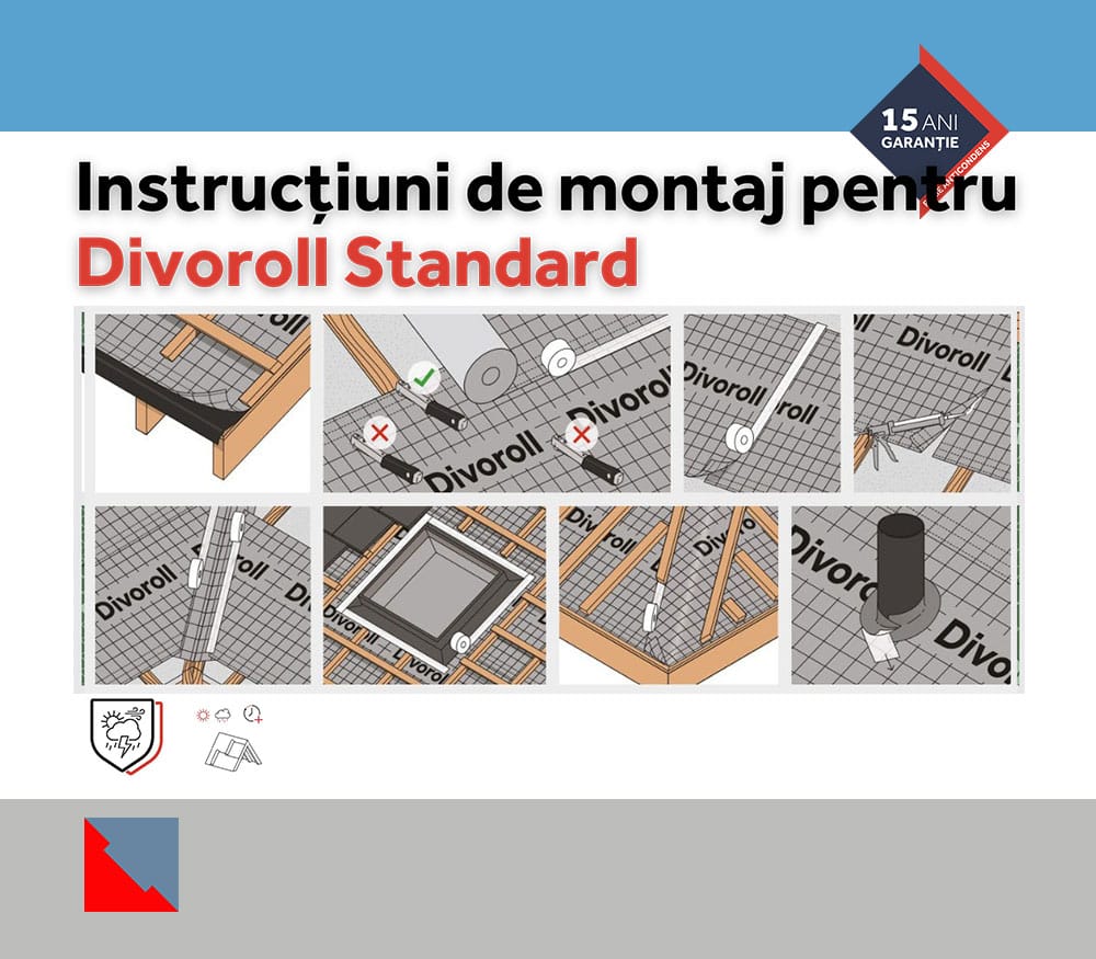 Divoroll Standard este o membrană cu 3 straturi, în culoare gri deschis, disponibilă în role de 1,5 m × 50 m (9,5 kg/rolă). Cu o greutate de 120 g/m² și o valoare Sd de 0,03 m, asigură o difuzie excelentă a vaporilor și protecție împotriva apei (clasa W1, coloană de apă >3000 mm). Rezistă la temperaturi între -40°C și +80°C și poate fi lăsată expusă la intemperii până la 2 săptămâni.